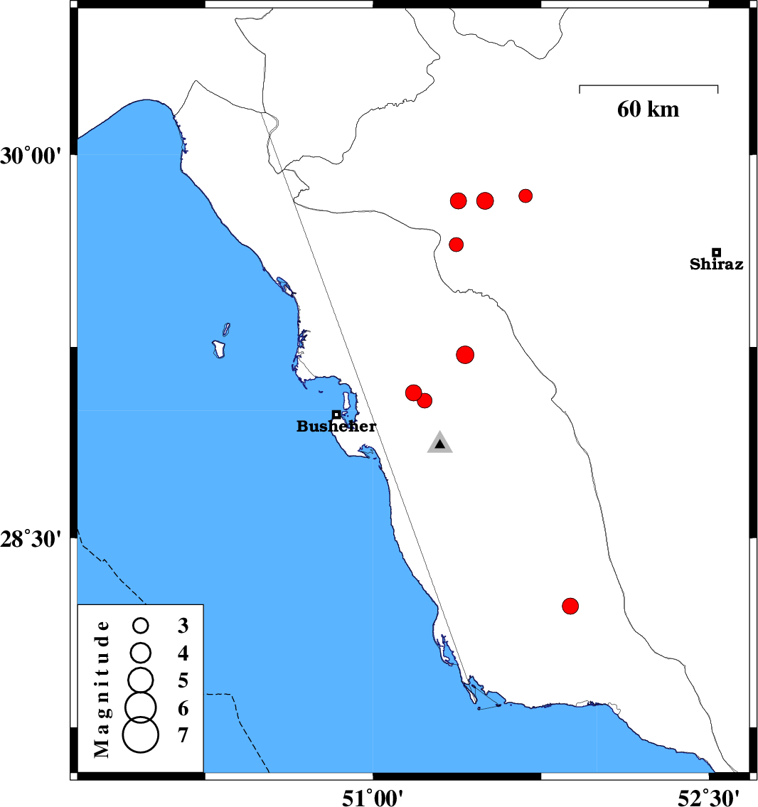 | 2011/12/05 | 06:12:45.0 | 09:42:45.0 | 29.22 | 51.41 | 3 | ML3.5 | Bushehr Province, 20 km East of Borazjan | ||