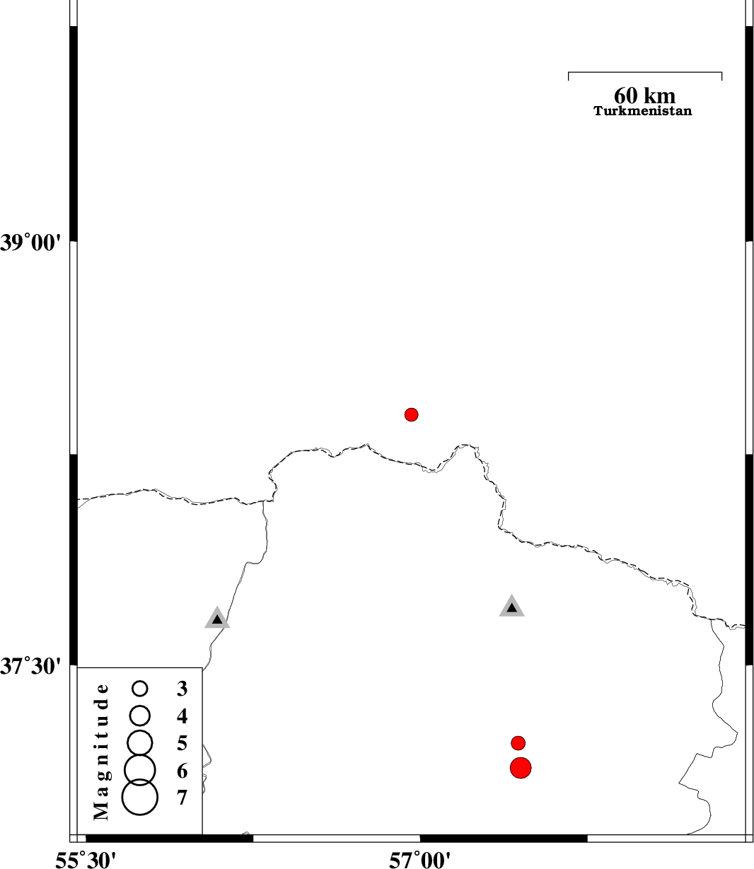 | 2011/12/11 | 04:17:20.9 | 07:47:20.9 | 38.39 | 56.96 | 6 | ML2.7 | Turkmenistan, 94 km North of Ashkhaneh | ||