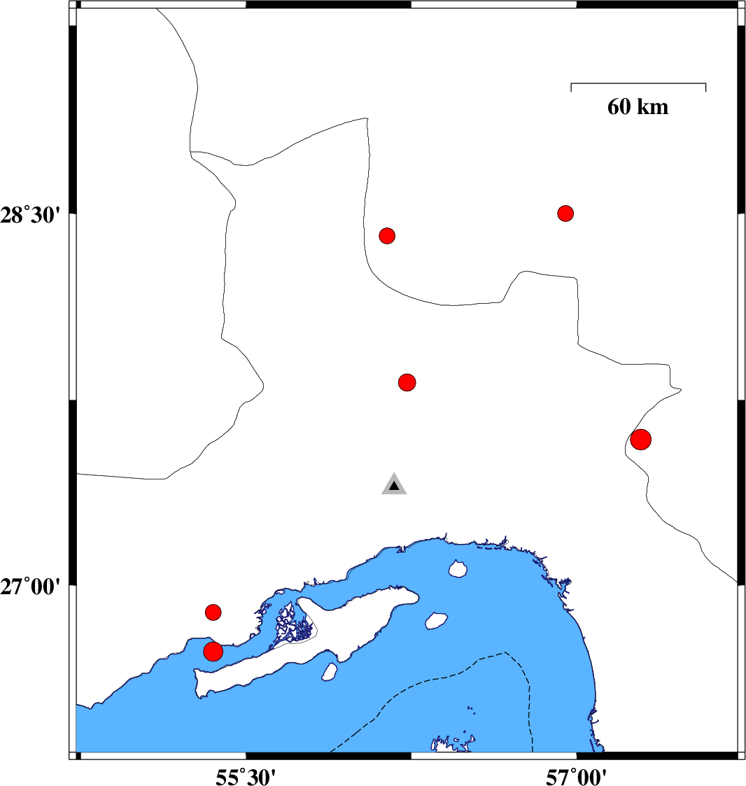 | 2011/11/20 | 00:40:59.0 | 04:10:59.0 | 27.59 | 57.29 | 42 | ML4.2 | Kerman Province, 19 km North of Dehbarez |