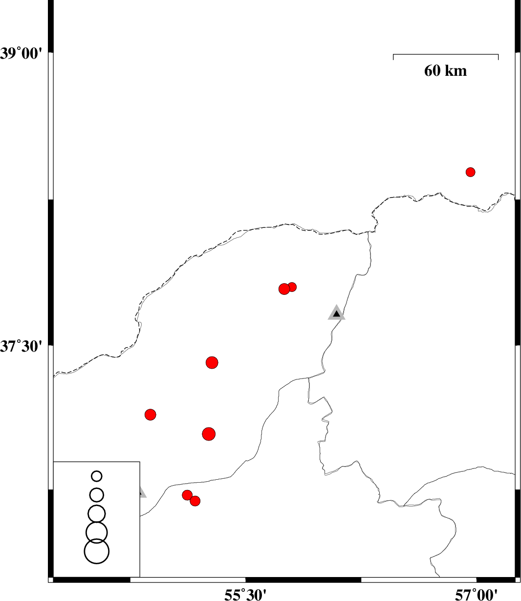 | 2011/12/01 | 03:56:42.1 | 07:26:42.1 | 37.8 | 55.8 | 6 | ML2.7 | Golestan Province, 54 km North-East of Kalaleh | ||