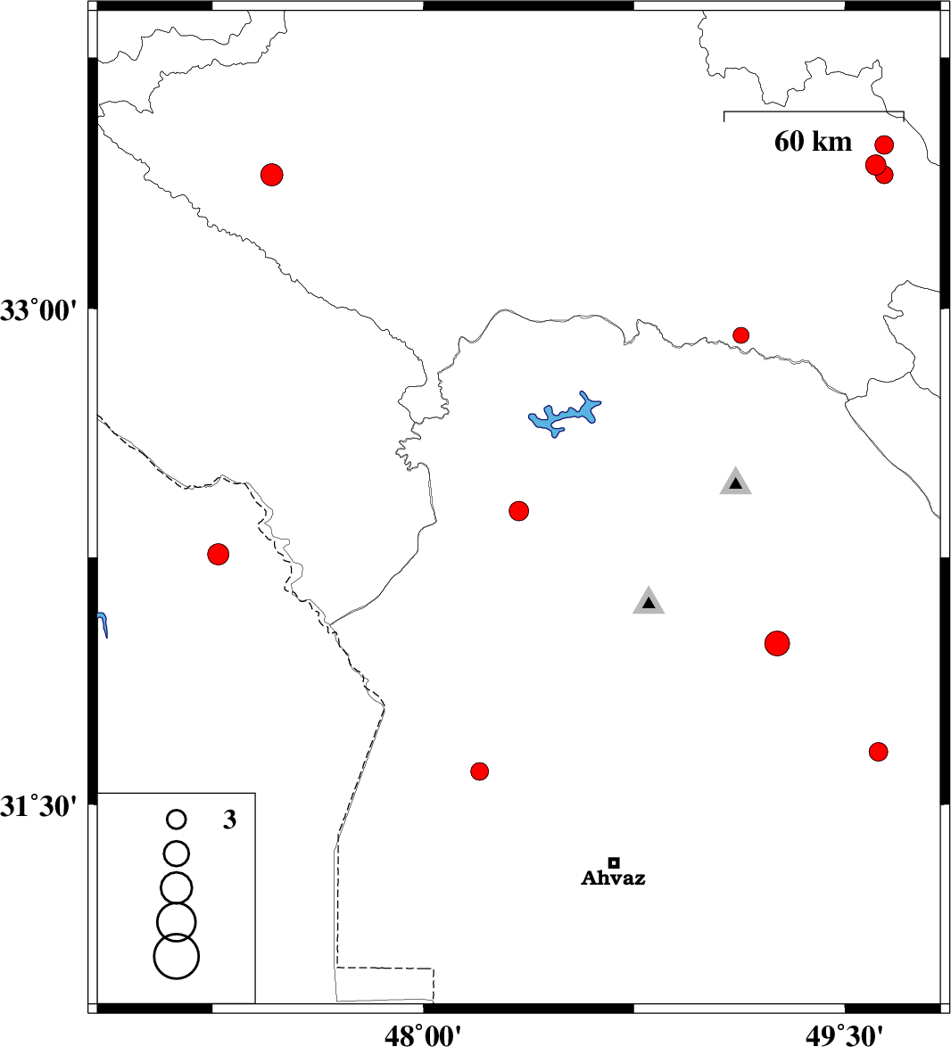 | 2011/11/17 | 00:31:23.2 | 04:01:23.2 | 31.6 | 48.2 | 15 | ML2.8 | Khoozestan Province, 5 km Susangerd |