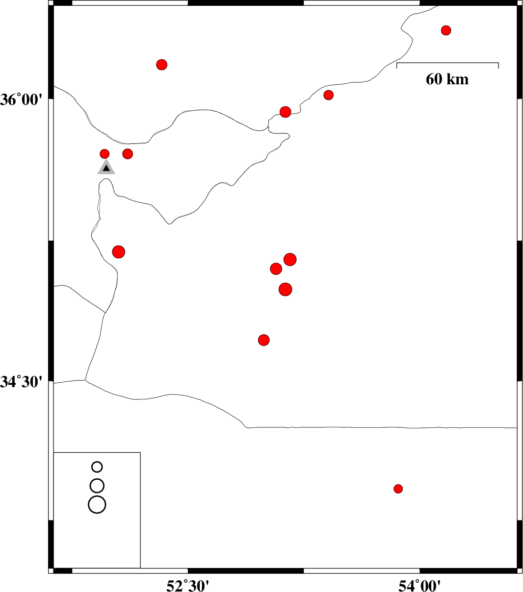 | 2011/12/01 | 07:48:09.8 | 11:18:09.8 | 35.19 | 52.05 | 16 | ML3.6 | Semnan Province, 26 km West of Garmsar |