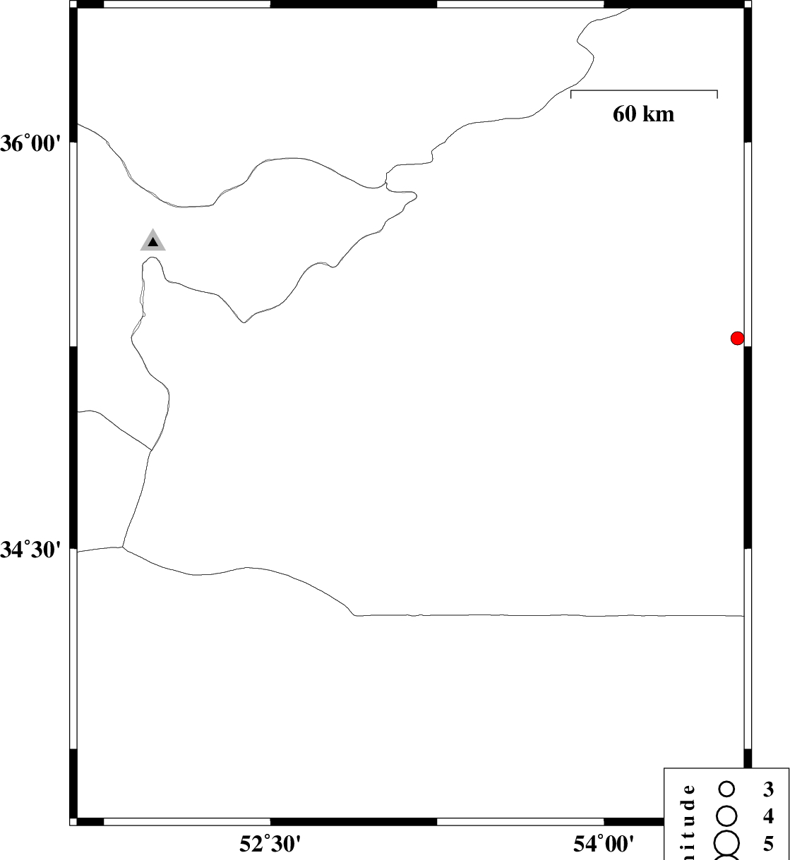 | 2011/12/09 | 01:12:50.1 | 04:42:50.1 | 34.72 | 52.99 | 14 | ML3.2 | Semnan Province, 82 km South-East of Garmsar | ||