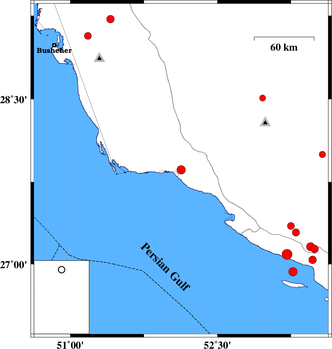| 2011/12/10 | 07:47:19.1 | 11:17:19.1 | 29.07 | 51.18 | 17 | ML3.2 | Bushehr Province, 21 km South of Borazjan | ||