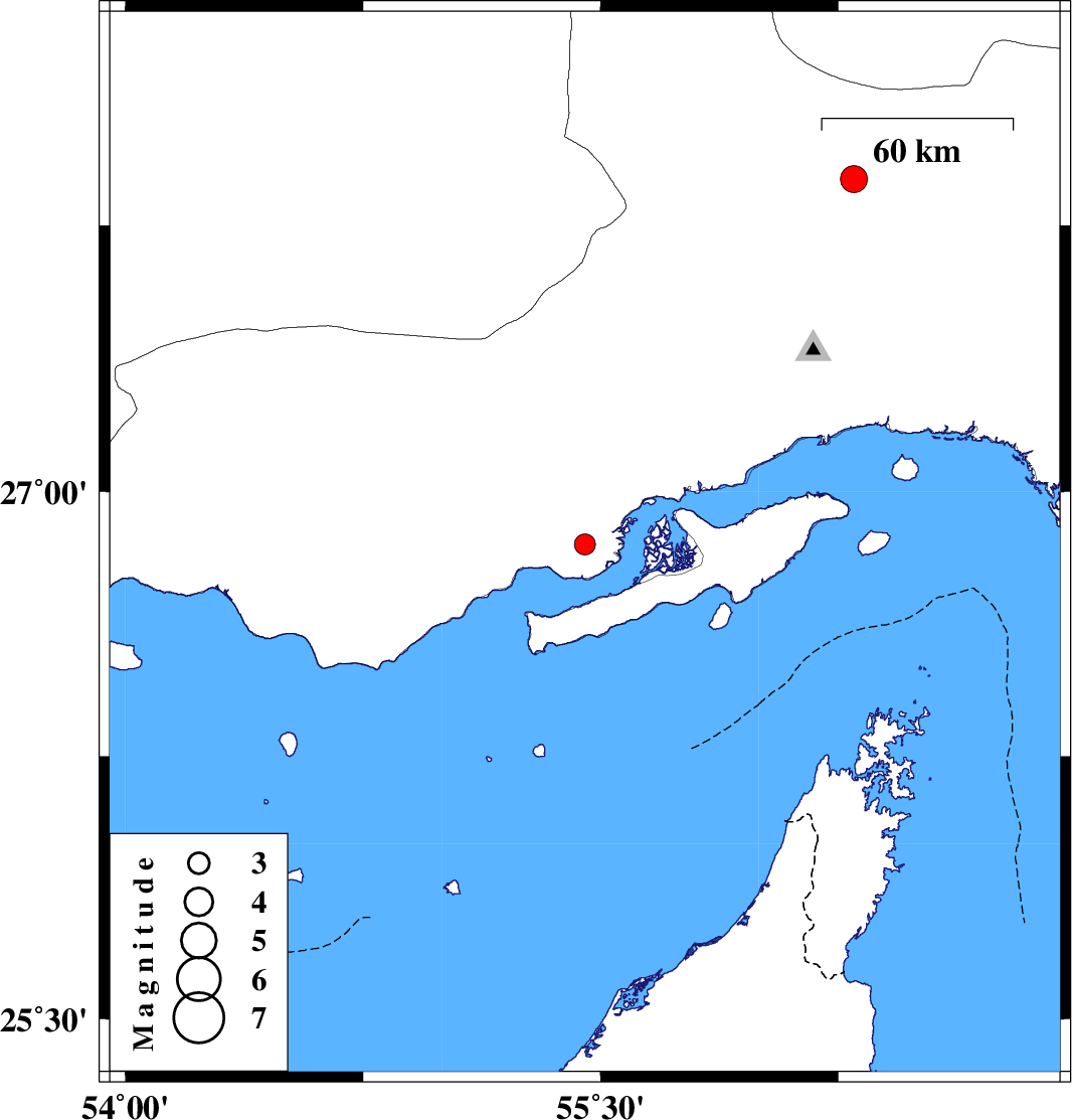 | 2011/12/28 | 19:15:27.0 | 22:45:27.0 | 26.85 | 55.45 | 17 | ML3 | Hormozgan Province, 81 km South-West of Qeshm | ||