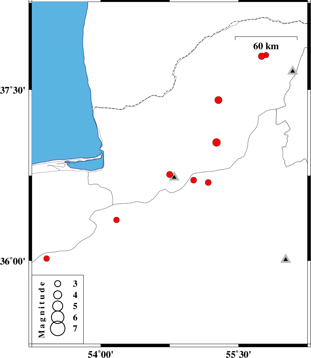 | 2011/12/01 | 03:56:42.1 | 07:26:42.1 | 37.8 | 55.8 | 6 | ML2.7 | Golestan Province, 54 km North-East of Kalaleh |