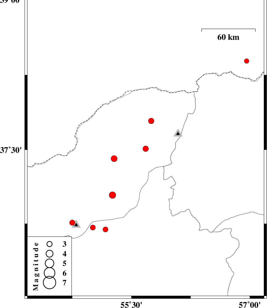 | 2012/01/03 | 16:47:33.3 | 20:17:33.3 | 37.51 | 55.68 | 15 | ML3.3 | Golestan Province, 22 km North-East of Kalaleh | ||