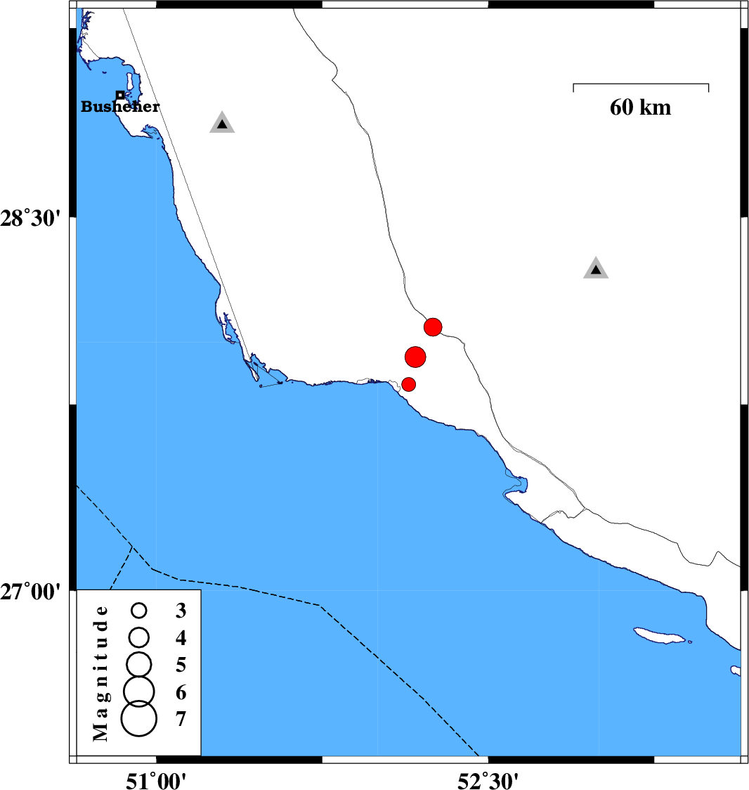 | 2012/01/05 | 17:49:11.2 | 21:19:11.2 | 28.06 | 52.25 | 42 | ML3.6 | Bushehr Province, 26 km North of Jam | ||