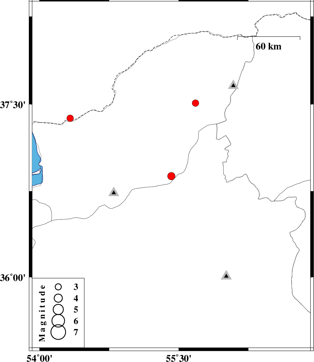 | 2012/01/07 | 15:12:23.2 | 18:42:23.2 | 36.88 | 55.42 | 14 | ML3.6 | Golestan Province, 39 km South of Minodasht | ||