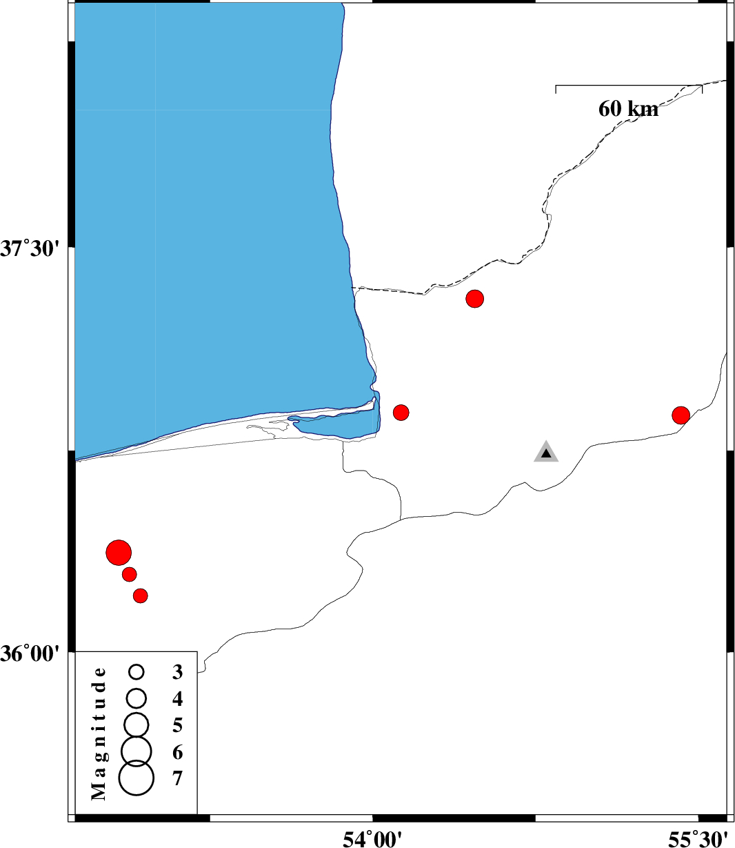| 2012/01/07 | 15:12:23.2 | 18:42:23.2 | 36.88 | 55.42 | 14 | ML3.6 | Golestan Province, 39 km South of Minodasht |