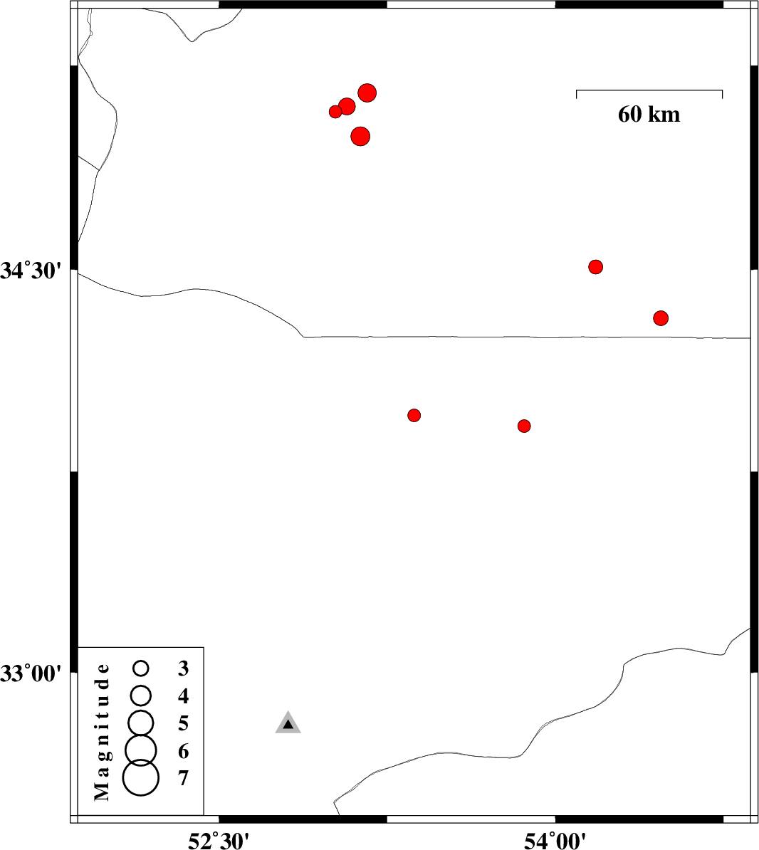 | 2012/01/09 | 18:11:59.9 | 21:41:59.9 | 34.32 | 54.47 | 15 | ML3 | Semnan Province, 205 km South-East of Damghan | ||