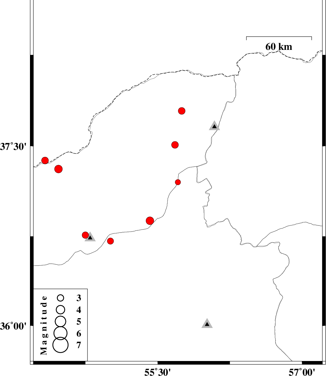 | 2012/01/10 | 16:14:01.7 | 19:44:01.7 | 37.31 | 54.47 | 14 | ML3.6 | Golestan Province, 33 km North of Aq Qaleh | ||