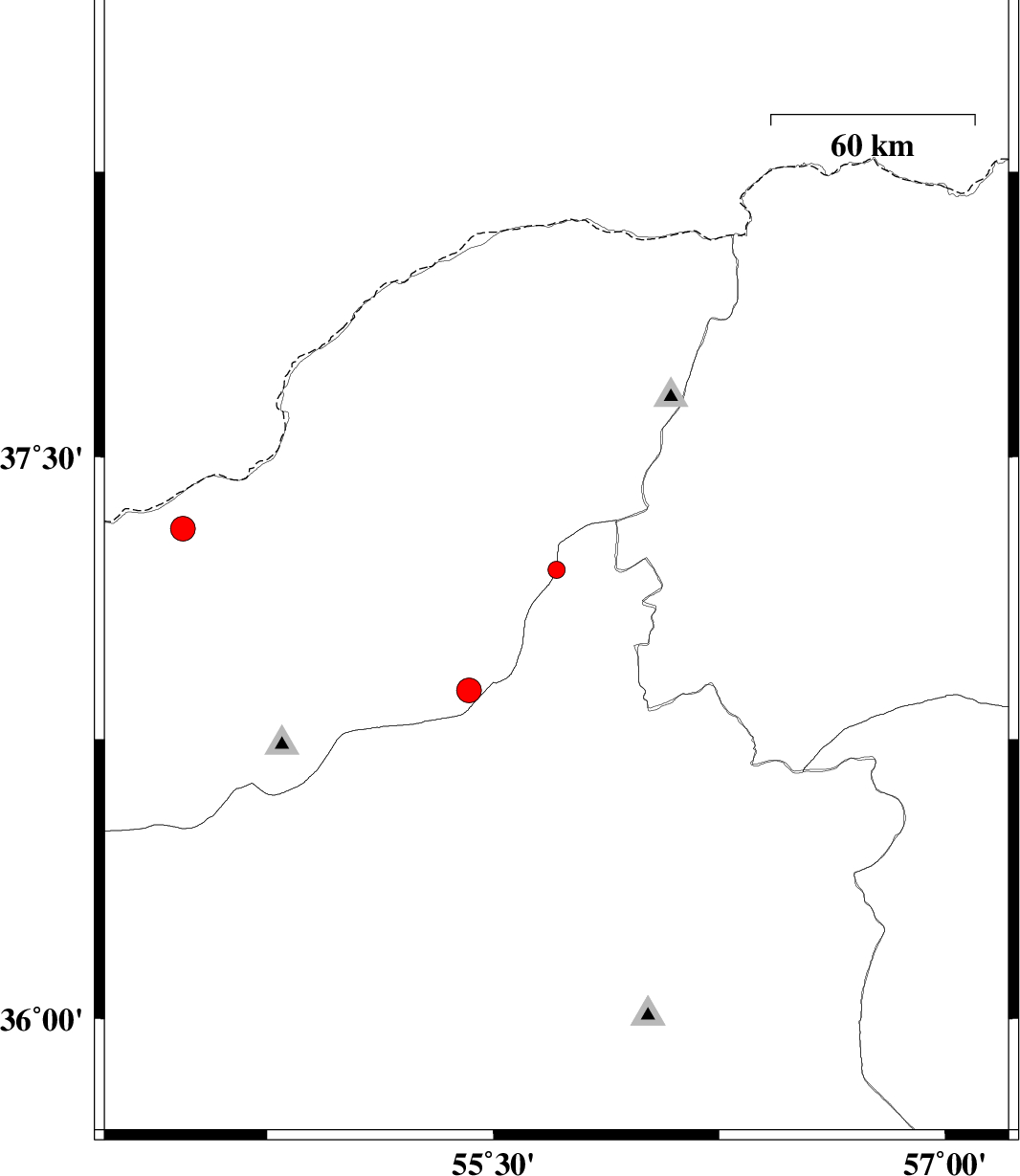 | 2012/01/10 | 16:14:01.7 | 19:44:01.7 | 37.31 | 54.47 | 14 | ML3.6 | Golestan Province, 33 km North of Aq Qaleh | ||
