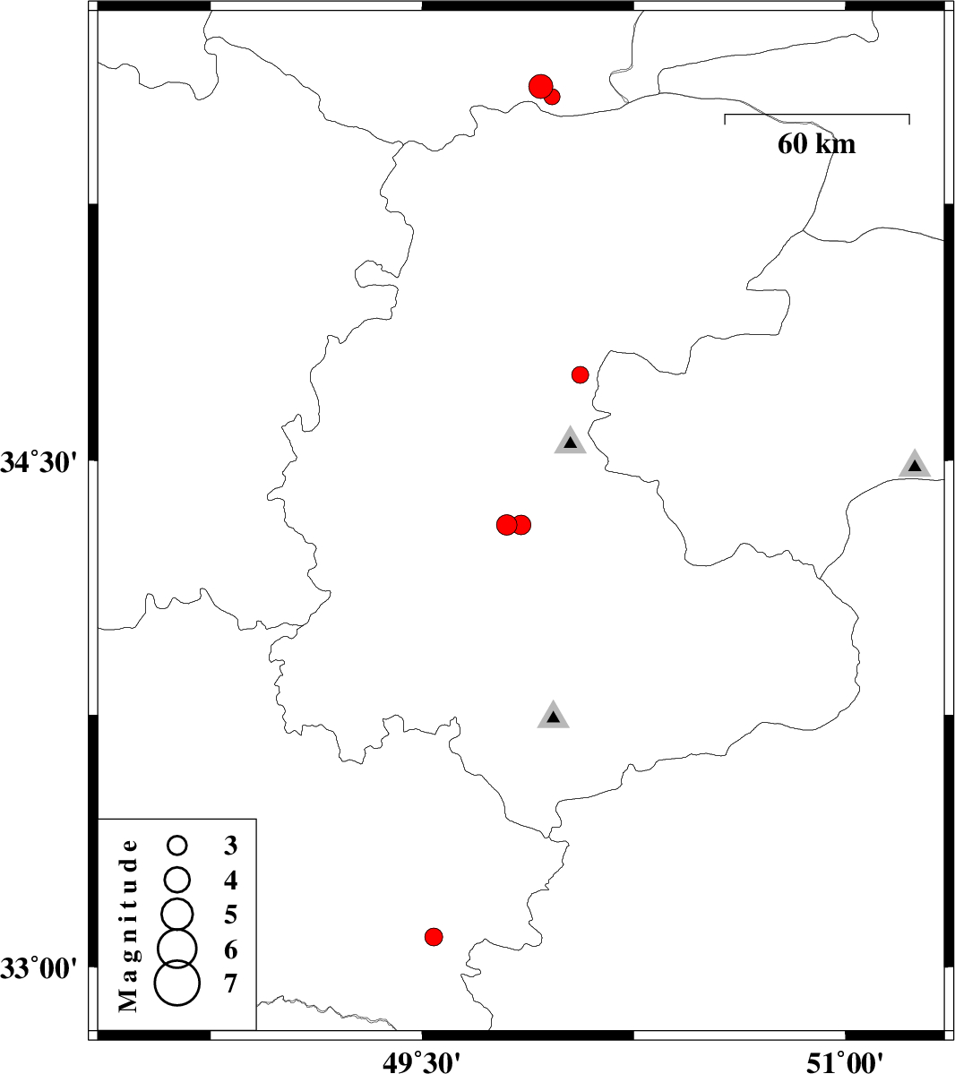 | 2012/01/14 | 09:45:11.9 | 13:15:11.9 | 33.09 | 49.54 | 15 | ML2.8 | Lorestan Province, 41 km South of Azna | ||