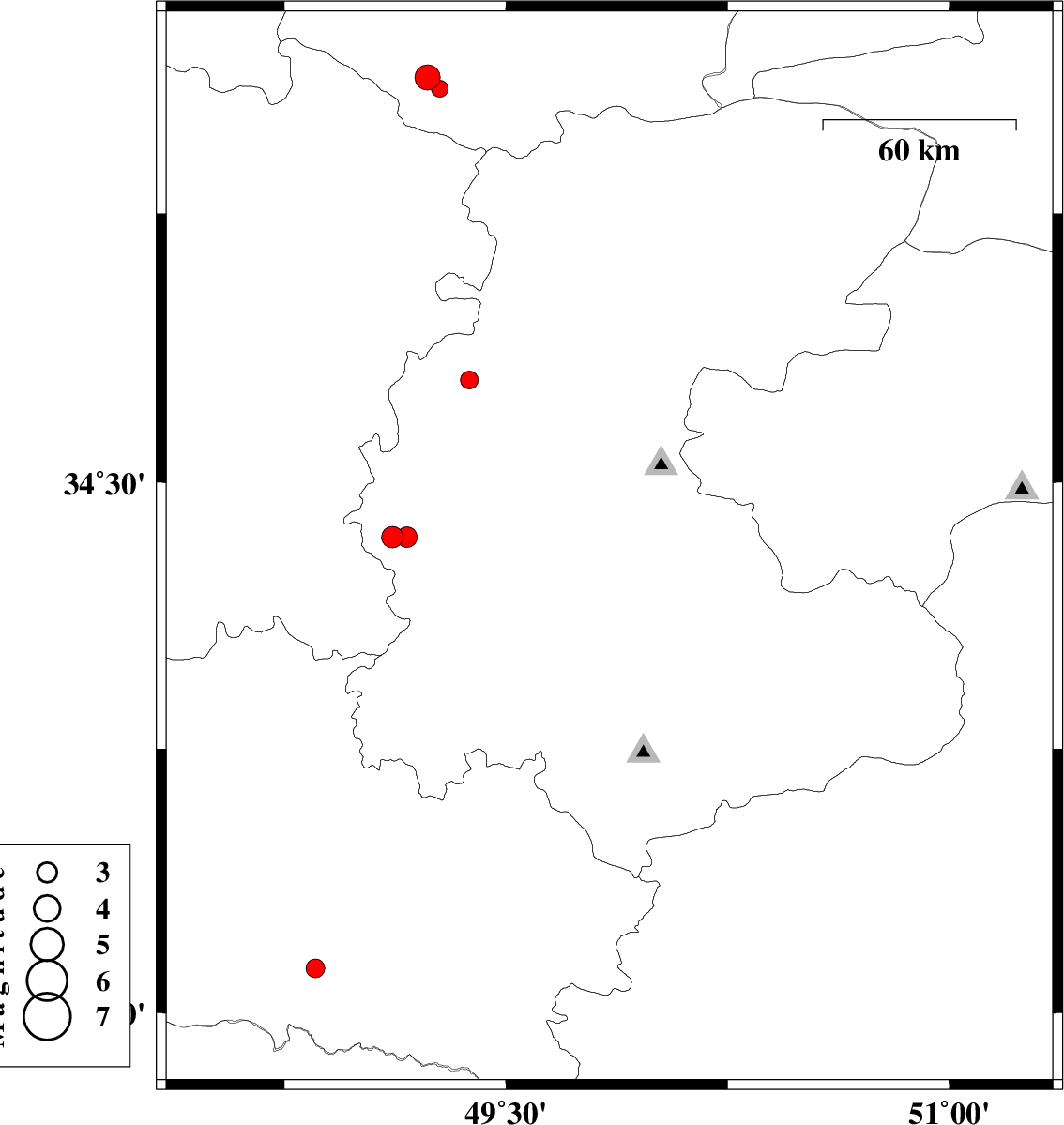 | 2012/01/14 | 22:32:52.4 | 02:02:52.4 | 34.31 | 49.85 | 11 | ML3.1 | Markazi Province, 28 km South-West of Ashtiyan | ||