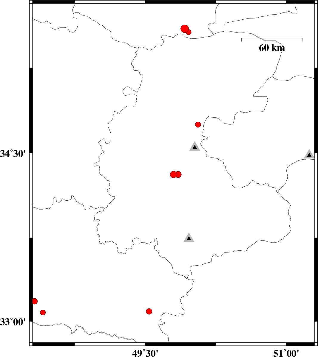 | 2012/01/14 | 22:32:52.4 | 02:02:52.4 | 34.31 | 49.85 | 11 | ML3.1 | Markazi Province, 28 km South-West of Ashtiyan | ||