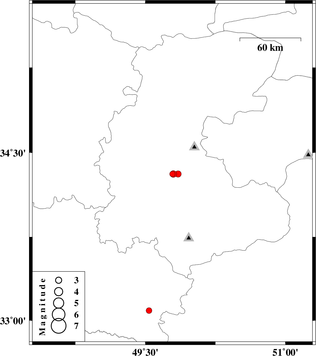 | 2012/01/14 | 09:45:11.9 | 13:15:11.9 | 33.09 | 49.54 | 15 | ML2.8 | Lorestan Province, 41 km South of Azna |