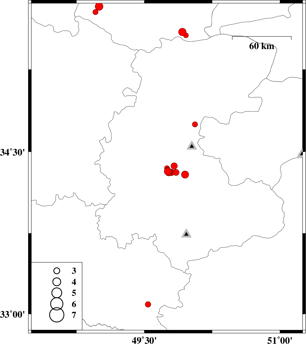 | 2012/01/15 | 05:59:20.1 | 09:29:20.1 | 34.31 | 49.79 | 14 | ML2.7 | Markazi Province, 27 km North-East of Arak | ||
