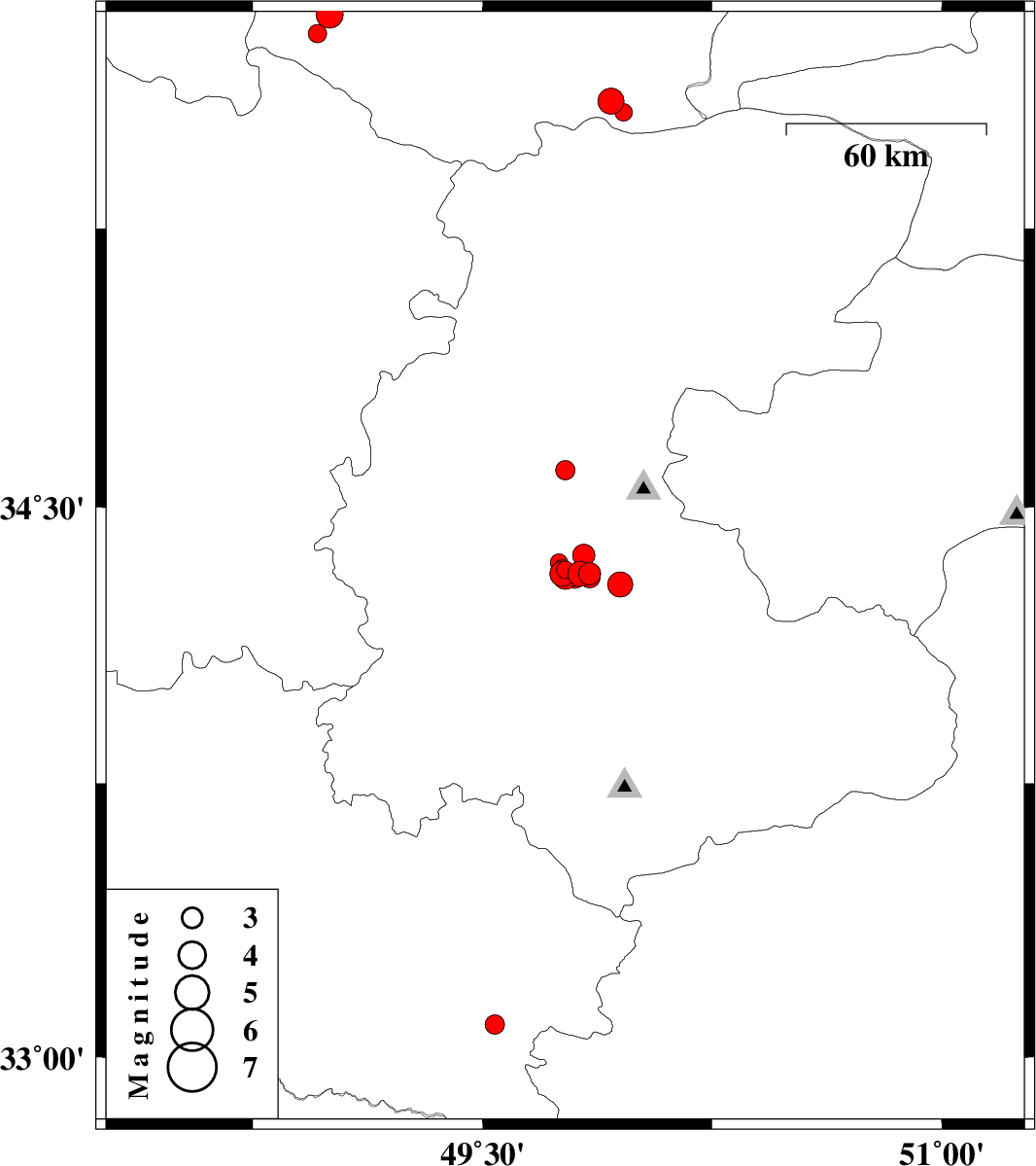 | 2012/01/17 | 23:45:50.0 | 03:15:50.0 | 34.32 | 49.76 | 14 | ML3.6 | Markazi Province, 27 km North of Arak | ||