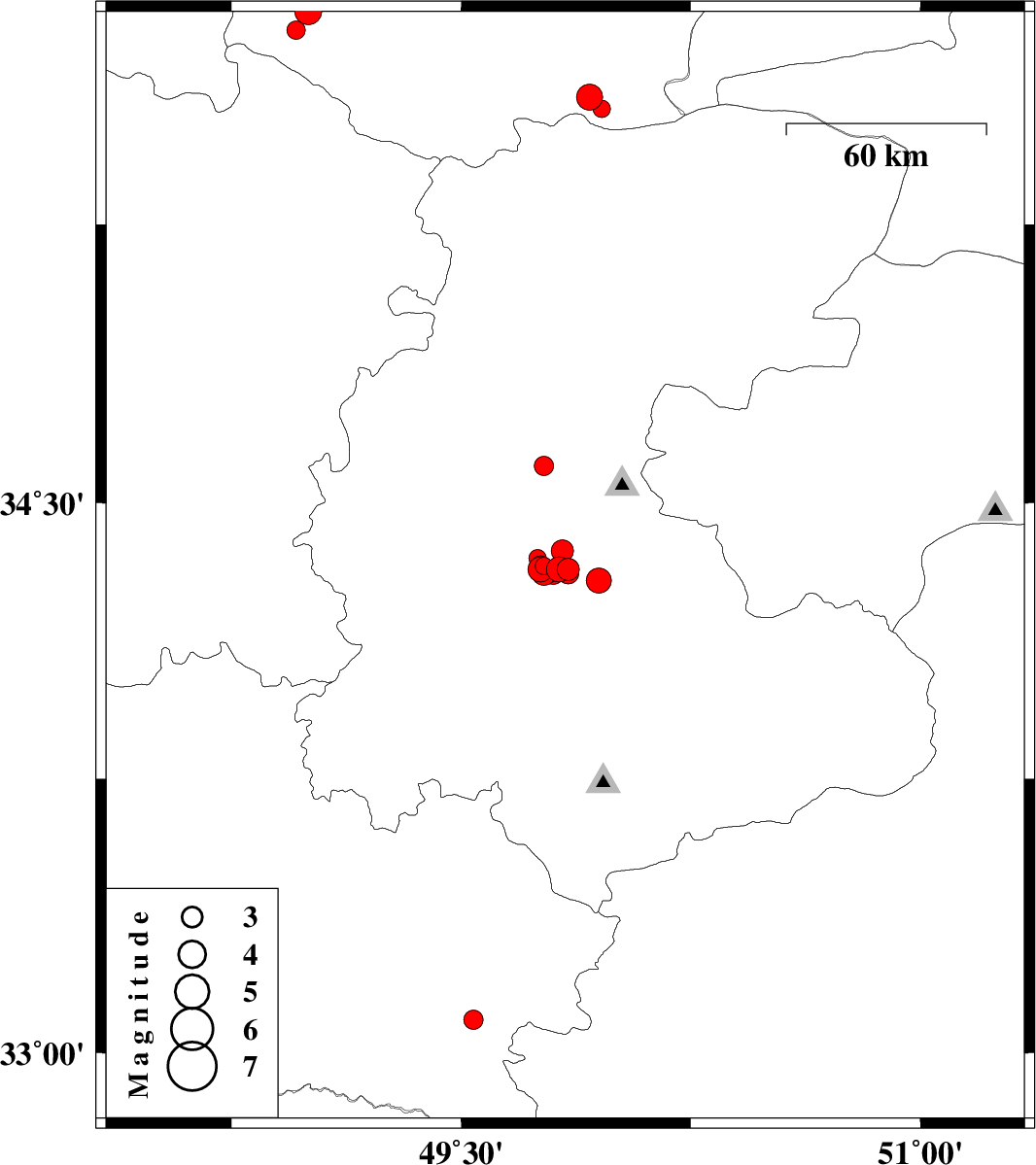 | 2012/01/17 | 23:45:50.0 | 03:15:50.0 | 34.32 | 49.76 | 14 | ML3.6 | Markazi Province, 27 km North of Arak | ||