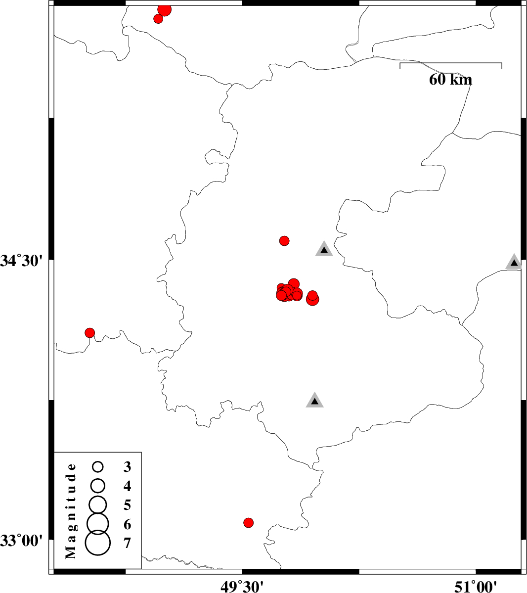 | 2012/01/17 | 23:45:50.0 | 03:15:50.0 | 34.32 | 49.76 | 14 | ML3.6 | Markazi Province, 27 km North of Arak | ||