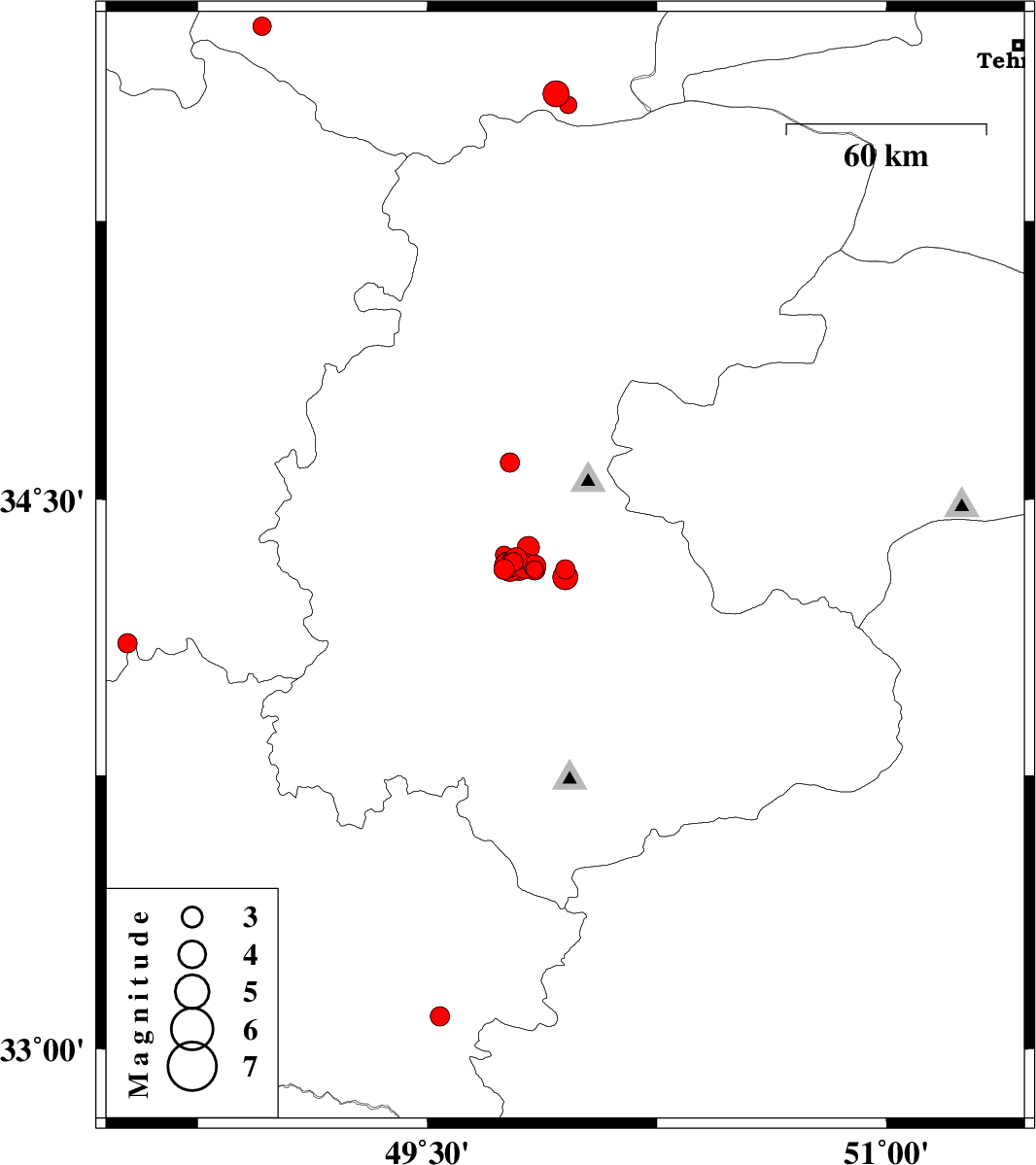 | 2012/01/17 | 23:45:50.0 | 03:15:50.0 | 34.32 | 49.76 | 14 | ML3.6 | Markazi Province, 27 km North of Arak | ||
