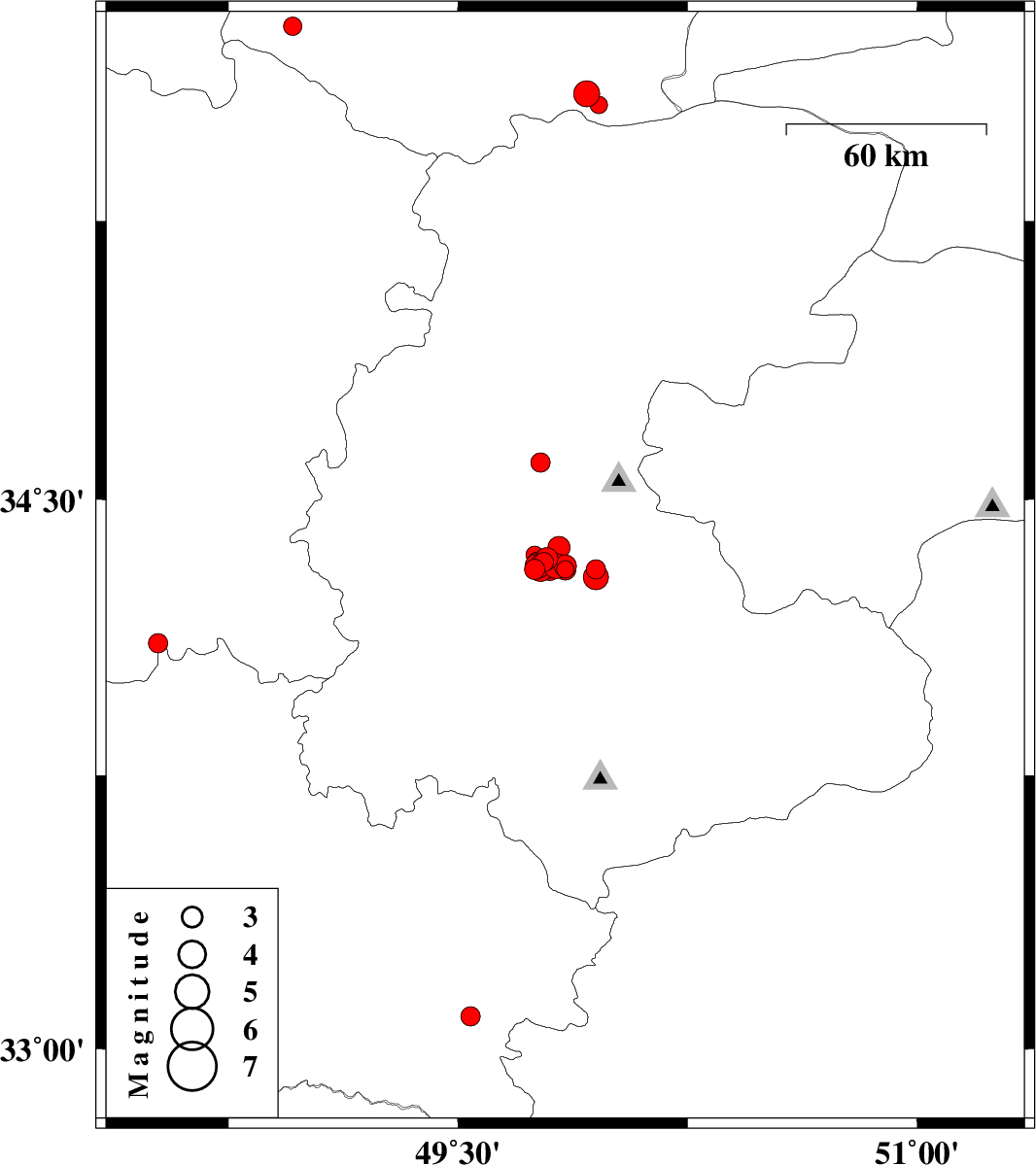 | 2011/12/22 | 18:39:00.8 | 22:09:00.8 | 33.08 | 48.41 | 30 | ML2.6 | Lorestan Province, 45 km South of Khorramabad |