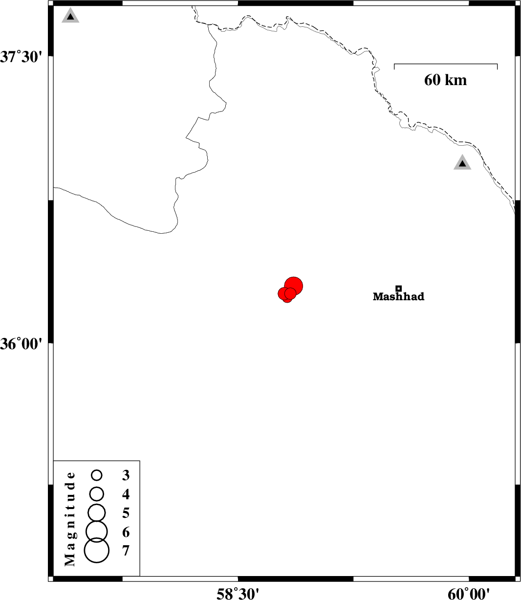 | 2012/01/19 | 12:35:51.2 | 16:05:51.2 | 36.3 | 58.86 | 16 | ML5.4 | Khorasan(center) Province, 12 km Neyshabur | download | |