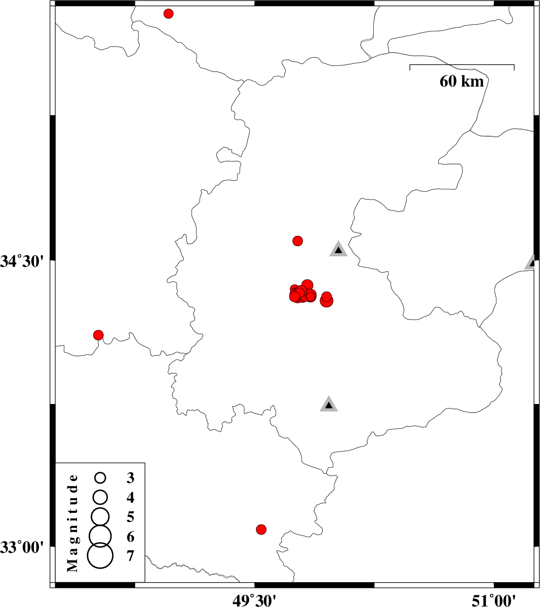 | 2012/01/17 | 23:45:50.0 | 03:15:50.0 | 34.32 | 49.76 | 14 | ML3.6 | Markazi Province, 27 km North of Arak | ||