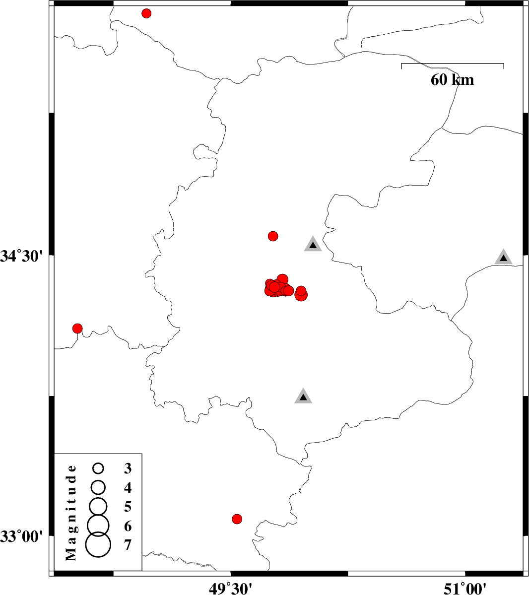 | 2012/01/14 | 09:45:11.9 | 13:15:11.9 | 33.09 | 49.54 | 15 | ML2.8 | Lorestan Province, 41 km South of Azna |