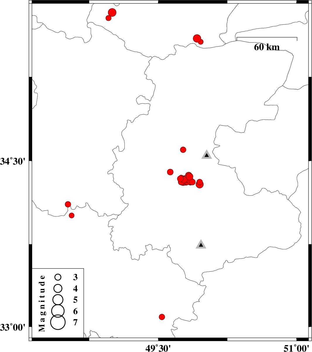 | 2012/01/20 | 06:49:49.9 | 10:19:49.9 | 34.33 | 49.78 | 14 | ML3.1 | Markazi Province, 29 km North of Arak | ||
