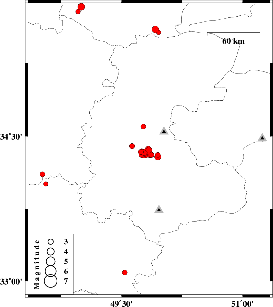 | 2012/01/20 | 03:42:15.2 | 07:12:15.2 | 34.34 | 49.76 | 14 | ML3 | Markazi Province, 29 km North of Arak | ||