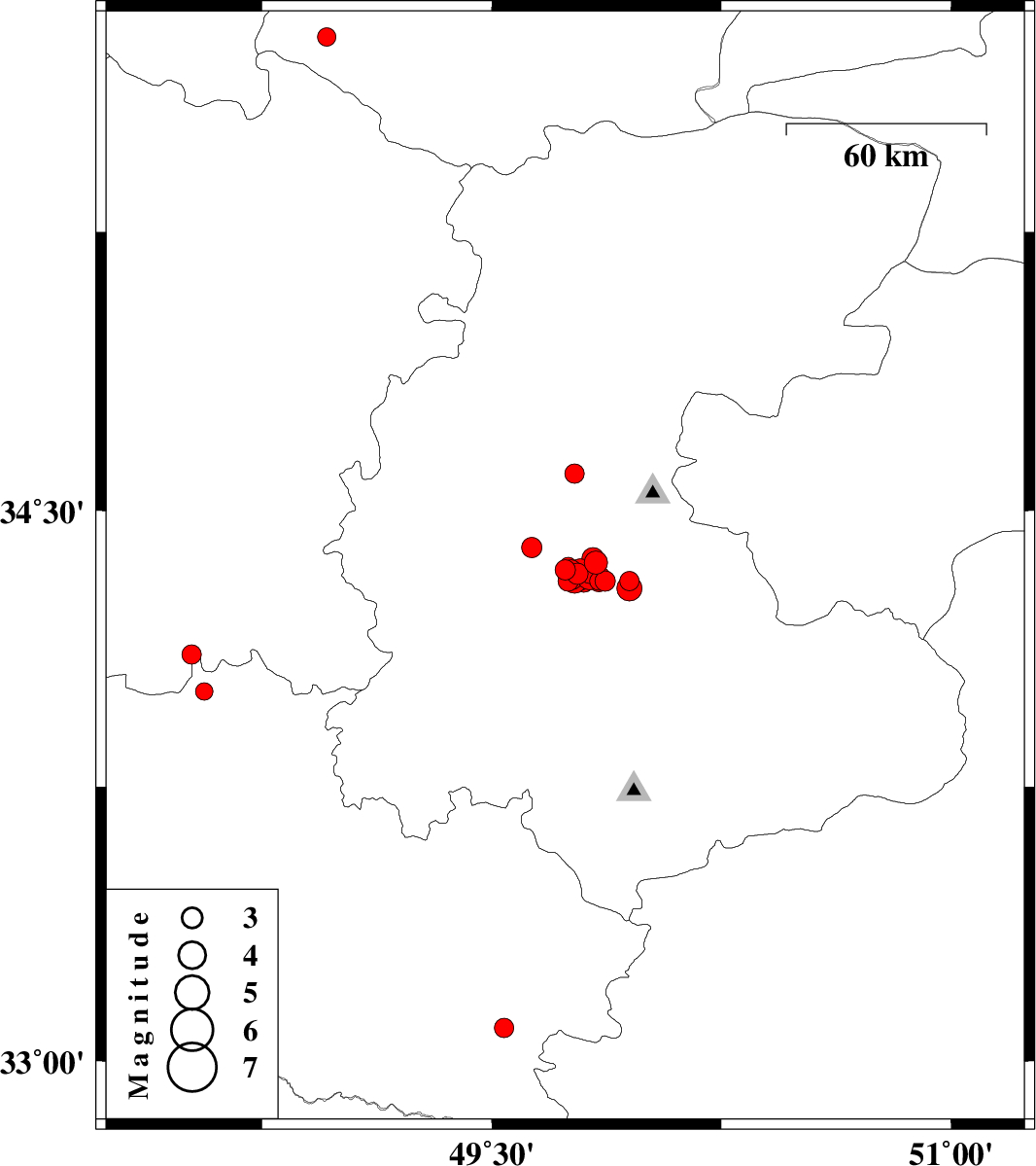 | 2012/01/20 | 03:42:15.2 | 07:12:15.2 | 34.34 | 49.76 | 14 | ML3 | Markazi Province, 29 km North of Arak | ||