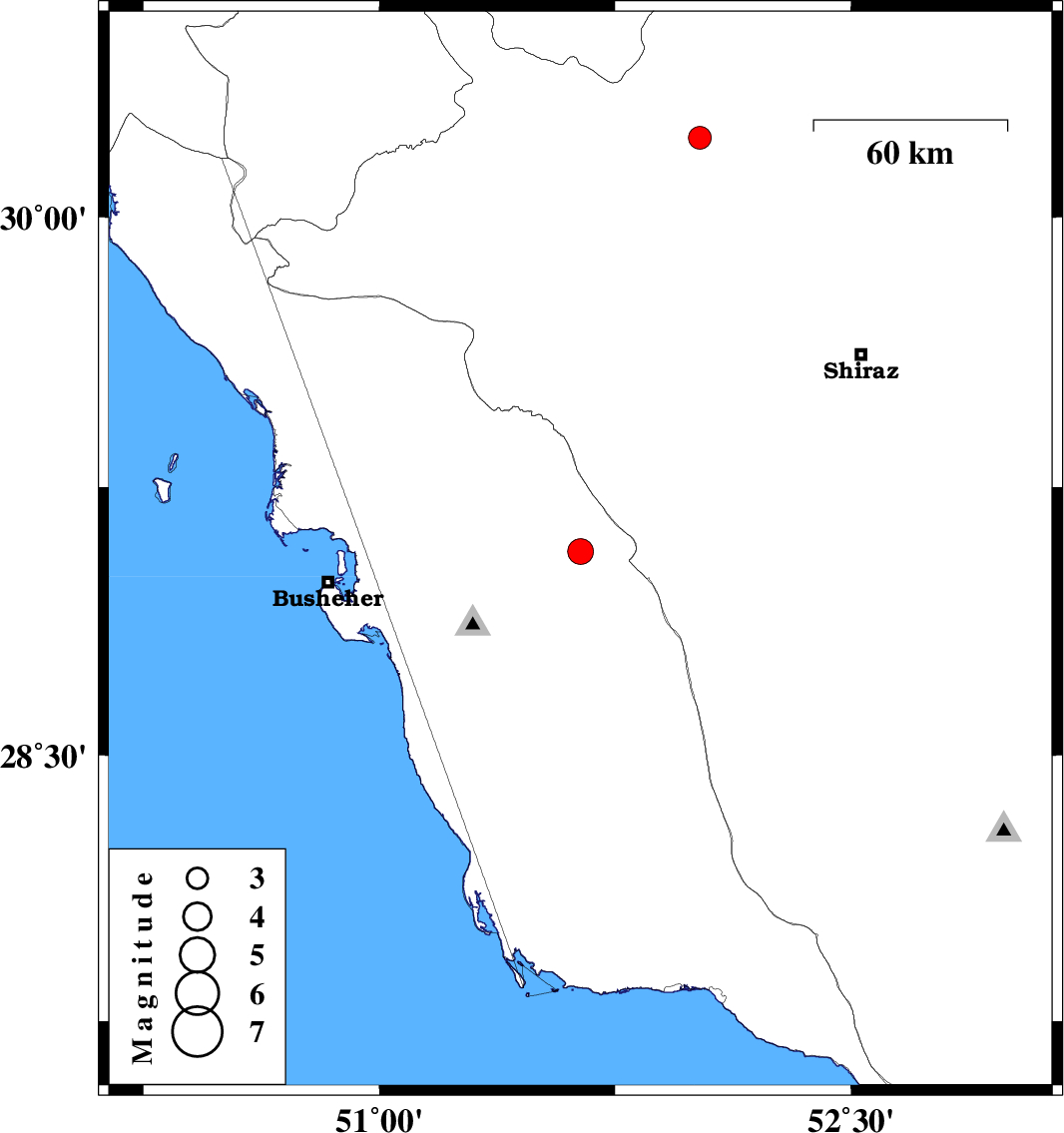 | 2012/01/22 | 03:22:20.2 | 06:52:20.2 | 29.07 | 51.64 | 29 | ML3.7 | Bushehr Province, 61 km South of Kazerun | ||