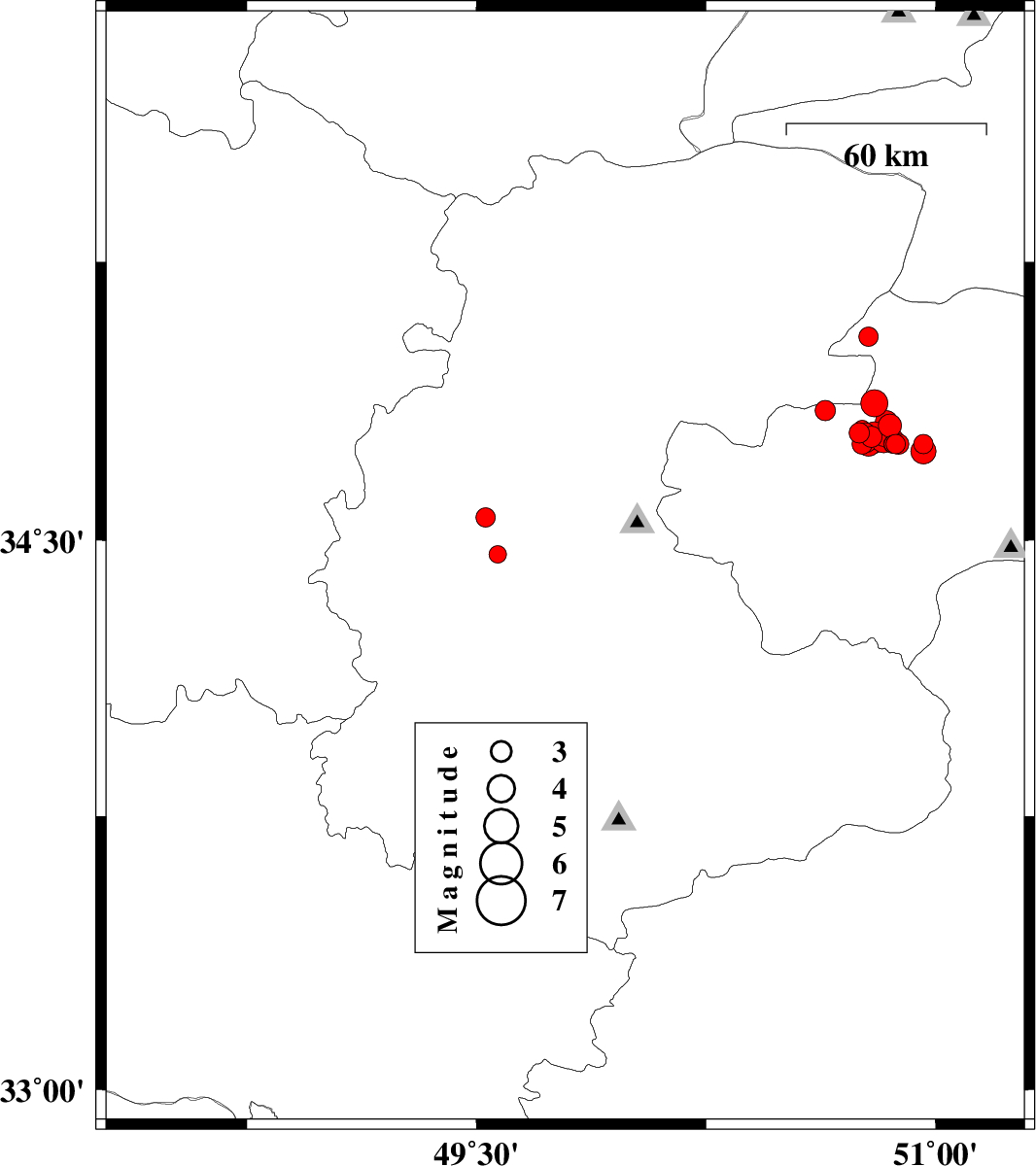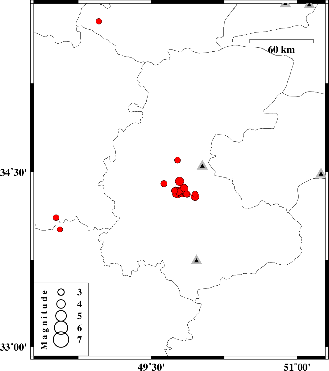 | 2012/01/20 | 06:49:49.9 | 10:19:49.9 | 34.33 | 49.78 | 14 | ML3.1 | Markazi Province, 29 km North of Arak | ||