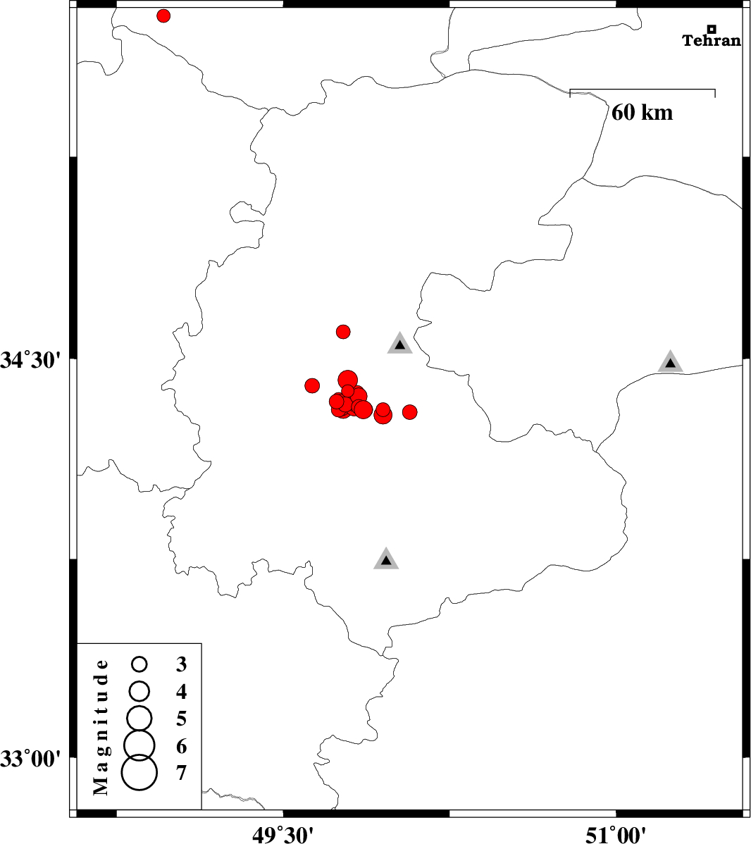 | 2012/01/20 | 06:49:49.9 | 10:19:49.9 | 34.33 | 49.78 | 14 | ML3.1 | Markazi Province, 29 km North of Arak | ||