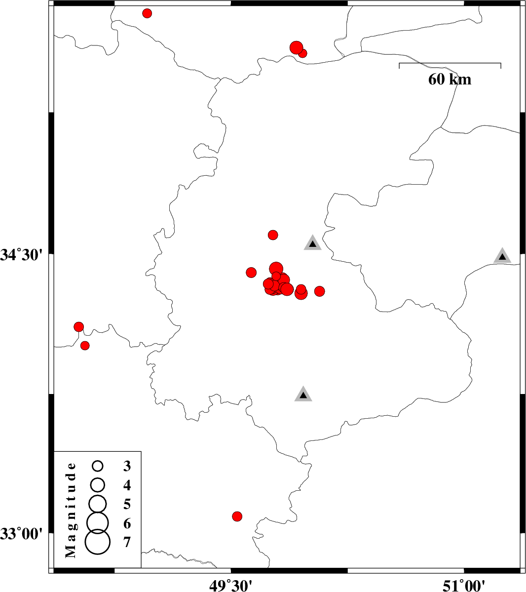 | 2012/01/21 | 05:52:30.7 | 09:22:30.7 | 34.01 | 48.56 | 14 | ML2.6 | Lorestan Province, 23 km North-West of Borujerd | ||