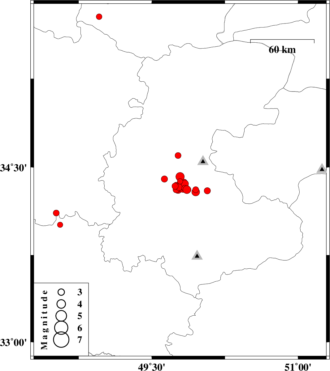 | 2012/01/20 | 06:49:49.9 | 10:19:49.9 | 34.33 | 49.78 | 14 | ML3.1 | Markazi Province, 29 km North of Arak | ||