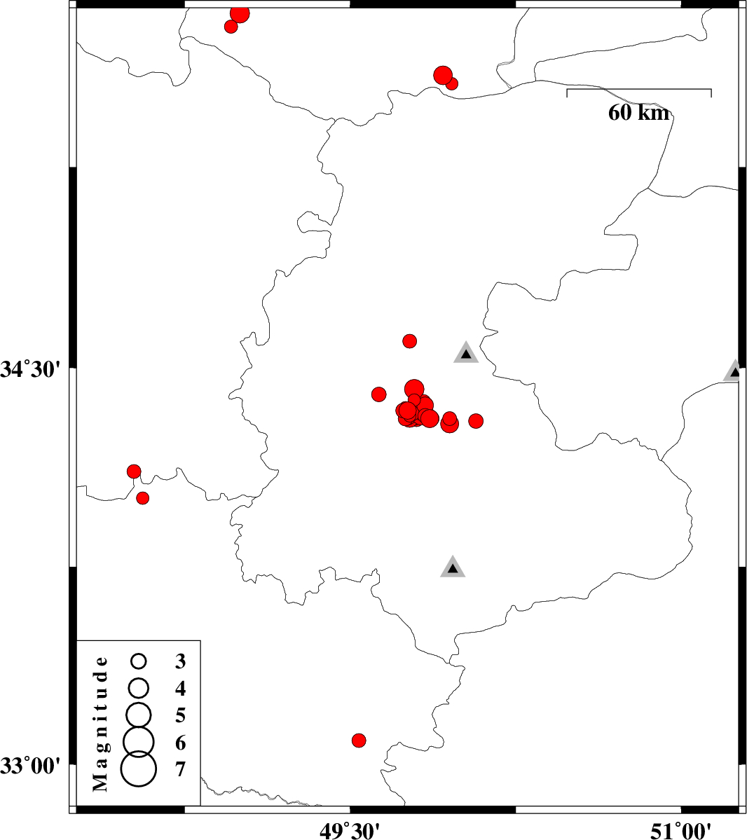 | 2012/01/22 | 09:44:51.2 | 13:14:51.2 | 34.42 | 49.79 | 12 | ML4 | Markazi Province, 23 km South-West of Ashtiyan | ||