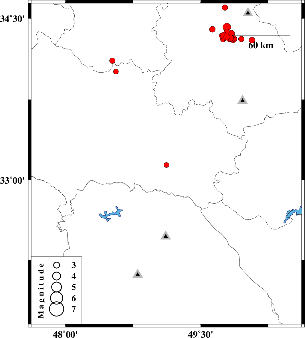 | 2012/01/20 | 06:49:49.9 | 10:19:49.9 | 34.33 | 49.78 | 14 | ML3.1 | Markazi Province, 29 km North of Arak | ||