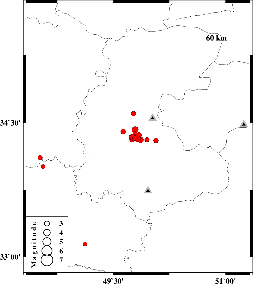 | 2012/01/20 | 06:49:49.9 | 10:19:49.9 | 34.33 | 49.78 | 14 | ML3.1 | Markazi Province, 29 km North of Arak | ||