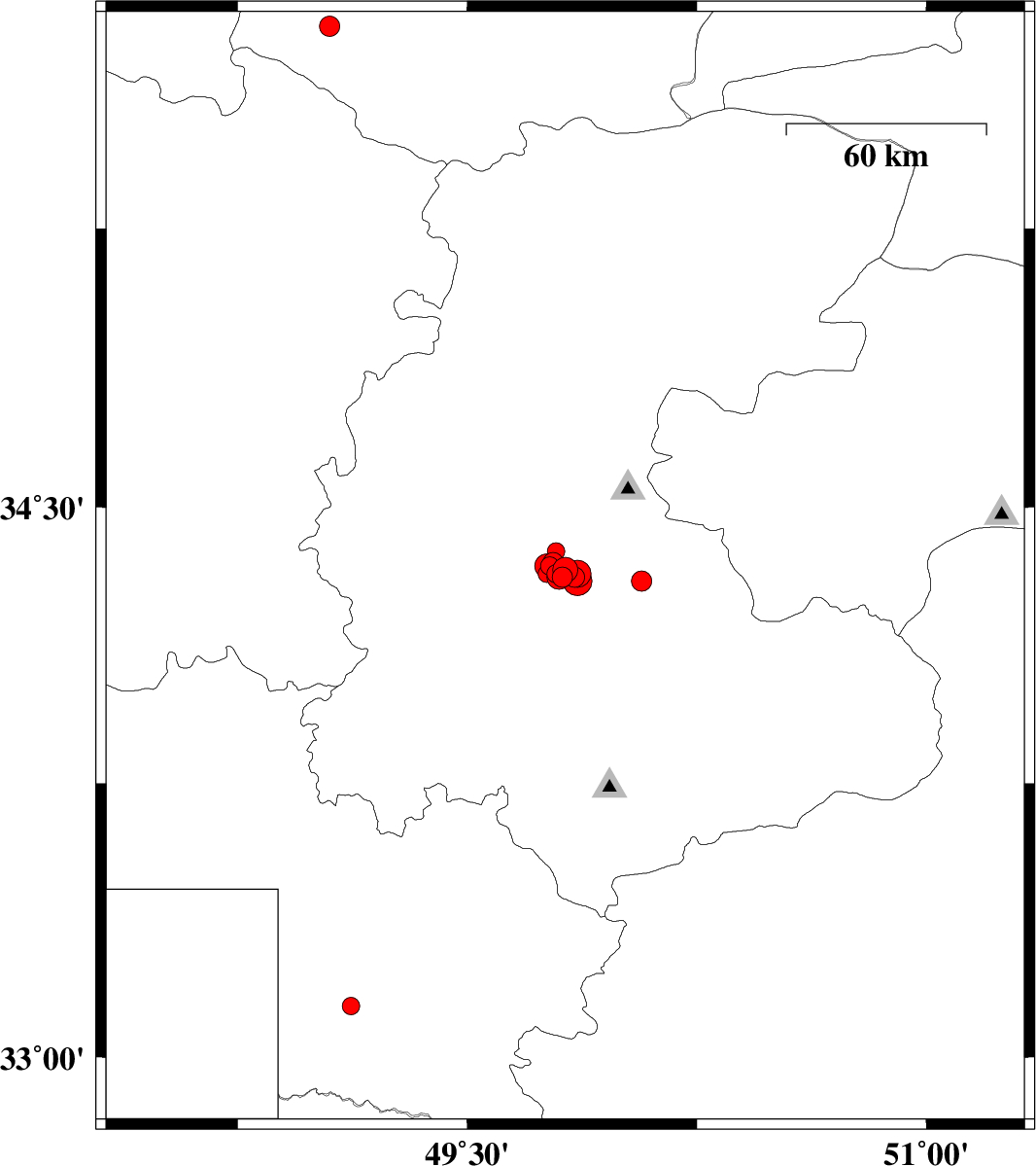 | 2012/01/25 | 13:30:51.5 | 17:00:51.5 | 34.31 | 49.85 | 12 | ML2.8 | Markazi Province, 28 km South-West of Ashtiyan | ||