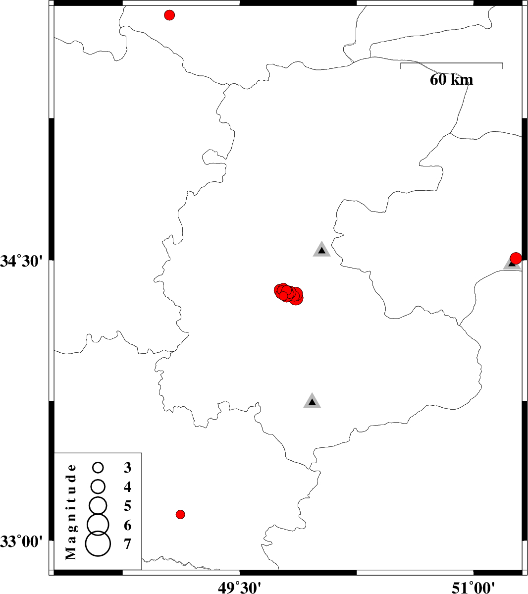 | 2012/01/24 | 09:43:51.3 | 13:13:51.3 | 34.32 | 49.77 | 14 | ML2.6 | Markazi Province, 27 km North of Arak |