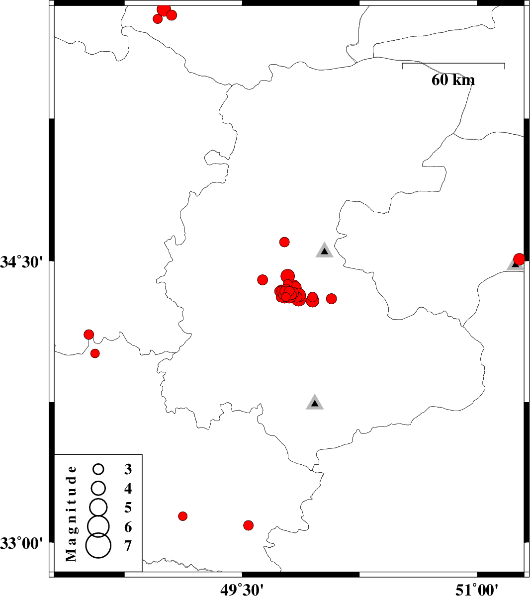 2012/01/14 09:45:11.9 13:15:11.9 33.0949.5415 ML2.8 Lorestan Province, 41 km South of Azna