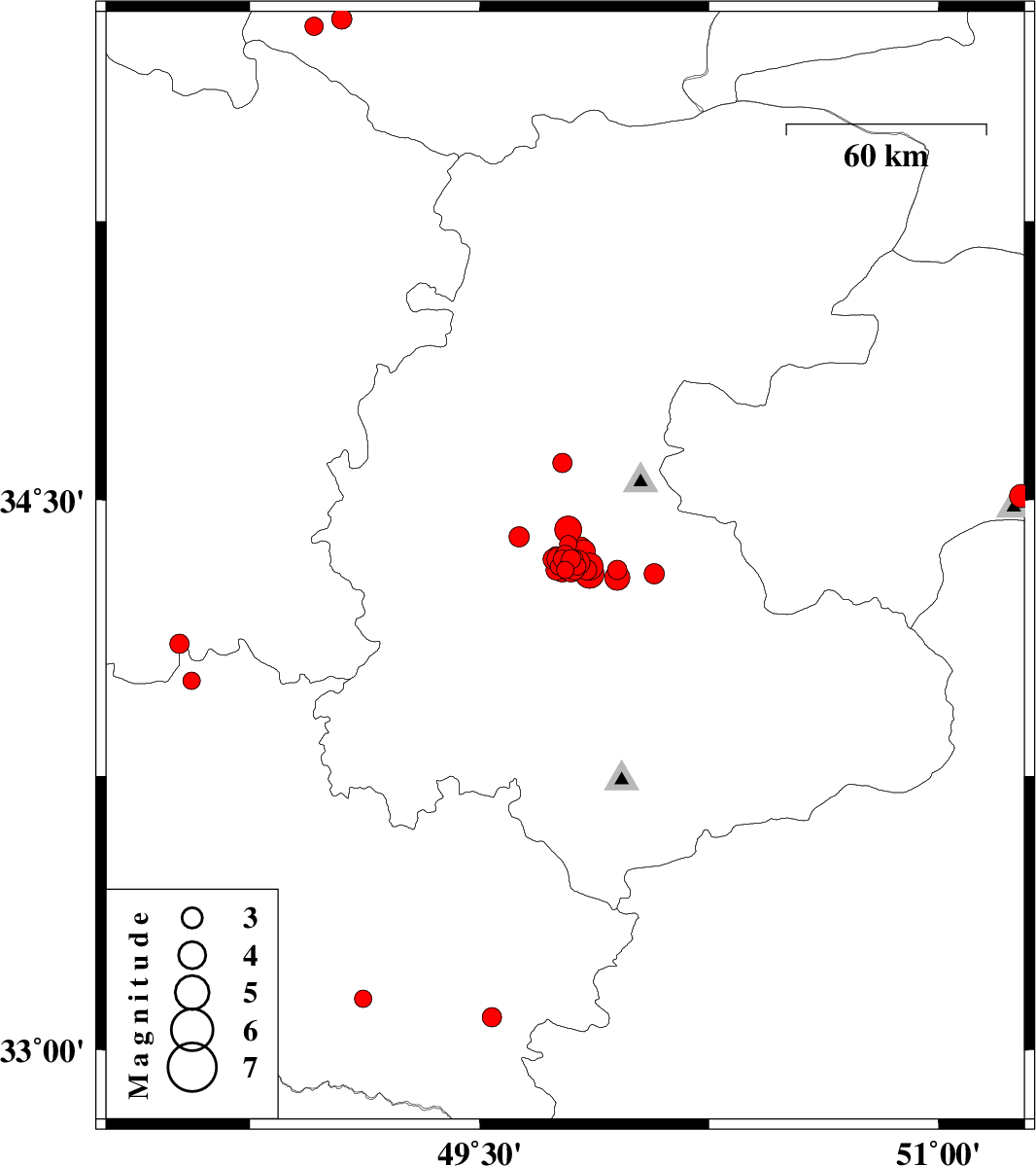 | 2012/01/22 | 09:44:51.2 | 13:14:51.2 | 34.42 | 49.79 | 12 | ML4 | Markazi Province, 23 km South-West of Ashtiyan | ||