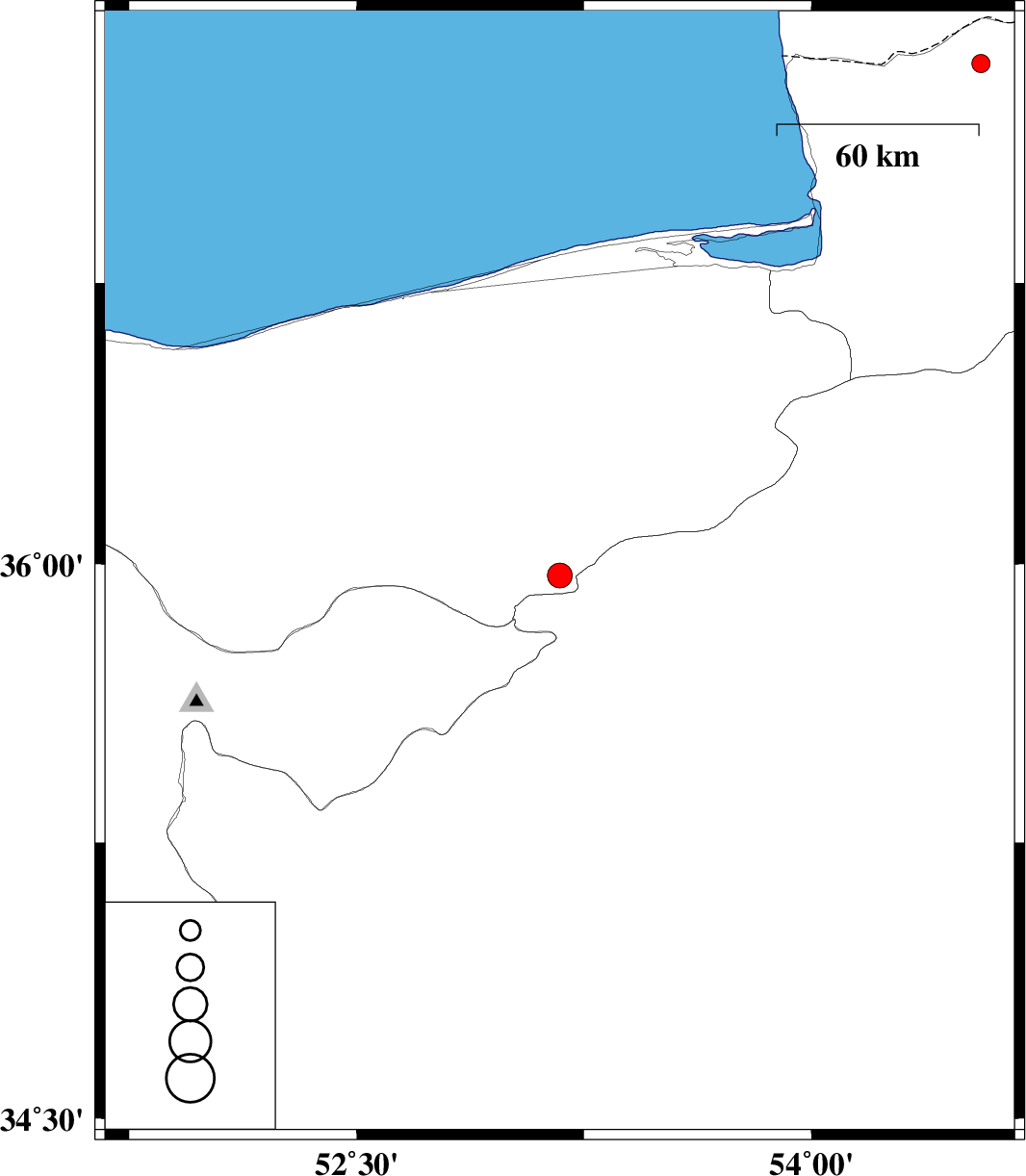 | 2012/02/02 | 03:51:51.1 | 07:21:51.1 | 35.97 | 53.17 | 15 | ML3.7 | Mazandaran Province, 19 km South-East of Pol-E-Sefid | ||