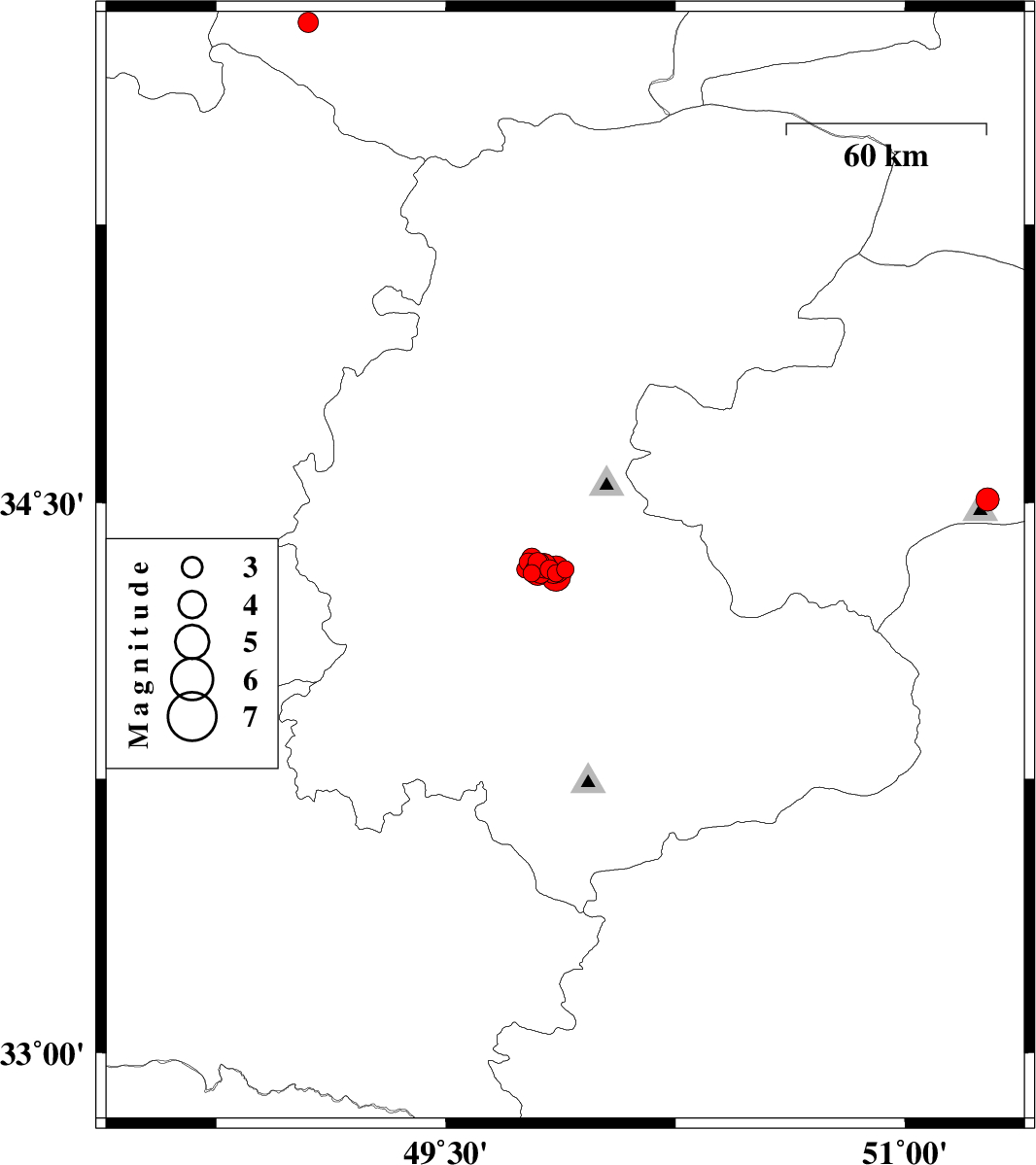 | 2012/01/31 | 04:06:05.8 | 07:36:05.8 | 34.32 | 49.82 | 24 | ML2.6 | Markazi Province, 29 km North-East of Arak | ||