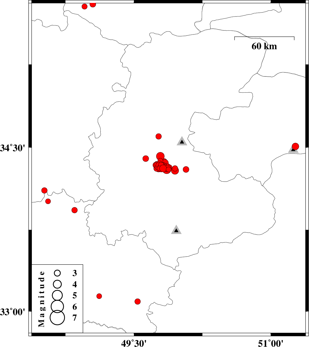 | 2012/01/20 | 06:49:49.9 | 10:19:49.9 | 34.33 | 49.78 | 14 | ML3.1 | Markazi Province, 29 km North of Arak | ||