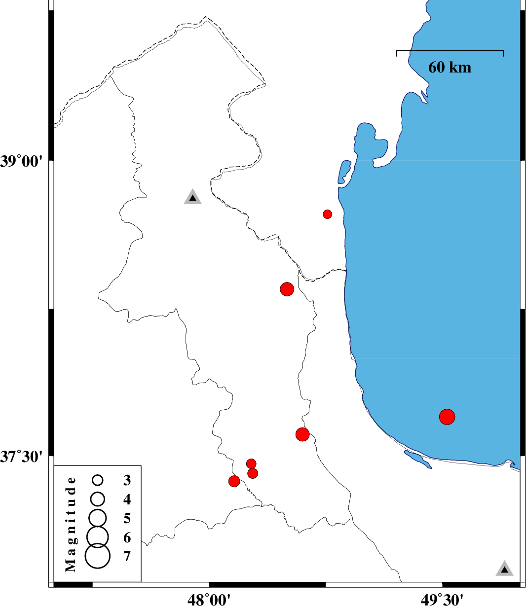 | 2012/02/04 | 20:04:14.0 | 23:34:14.0 | 37.7 | 49.53 | 40 | ML4.5 | Caspian Sea, 26 km North of Bandar-e anzali | ||