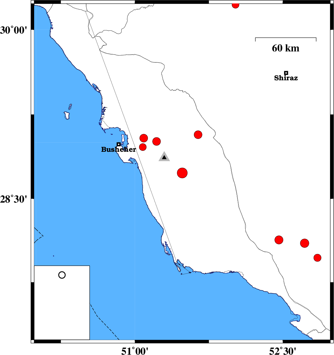| 2012/01/25 | 11:14:06.2 | 14:44:06.2 | 28.96 | 51.08 | 17 | ML3.3 | Bushehr Province, 20 km West of Ahram | ||